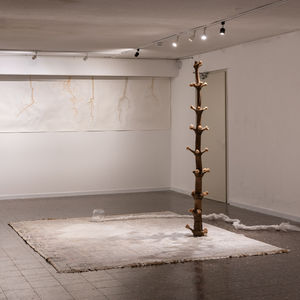 השטיח מסמל עבורי חלל אינטימי של חדר ילדים. מתוכו בוקע גזע עץ מת שמצמיח אובייקטים מנסורת וגבישים מהשדה. הטוטם שנוצר הוא מעין 'אמא שומרת', משקיפה. על השטיח שצבוע לבן, שלולית צבע נוספת שמדמה שטיח עשוי מחיה פשוטת עור שמשורטטת לפי ממדי גופי השוכב ב''תנוחת האישה'' ביוגה. בצנצנת שמונחת על השטיח ישנם חלקי צבע סיד יבש ושבור, שגם הם מסמלים חלקים ממני. לצנצנת מחוברת צמה מניילון מוקצף לאריזה שנועד להגן משריטות ושברים-שפורצת החוצה ומתנפנפת. הצבע הלבן הוא סימן שהייתי פה. אני מסמנת, מנסה להגן, וגם חונקת.